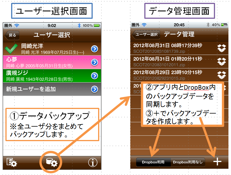 ver1.3以降で、DropBoxにバックアップを取得できるようになりました。下図のように、データ管理画面で、+ボタンを押すと、アプリ内にバックアップデータ(全ユーザー分を一括してバックアップします)を作製します。このバックアップデータを、[DropBox利用]を選択しておくと、DropBoxフォルダ内の「Apps>Okusuri Techo」にデータ同期保存します。機種変更等でバックアップからデータを復元する場合には、このデータ管理画面でDropBox利用を選択して同期し、同期された最新のバックアップから復元をする事が出来ます。