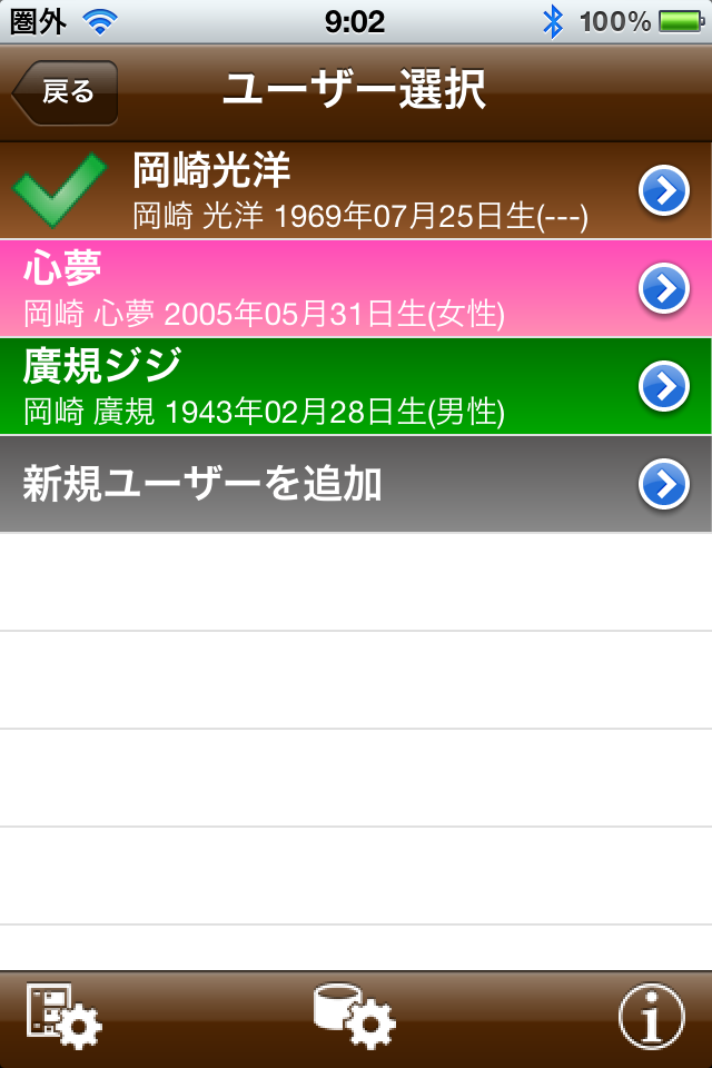 複数の方のお薬手帳を登録されていると、画面写真のように並んで表示されます。お使いになる方を選択すると、“✓”マークがニックネームの前に付きます。上部バー・左【戻る】ボタンから、選んだ方のお薬手帳のメイン画面が表示されます。