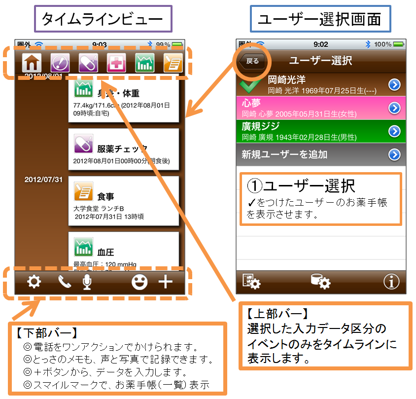 タイムライン表示は、このお薬手帳のメイン画面で、入力したデータを時系列で並べて表示している事です。