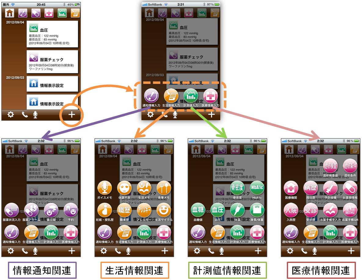 ④ 情報通知関連 … 病院予約や薬の服用アラームの設定