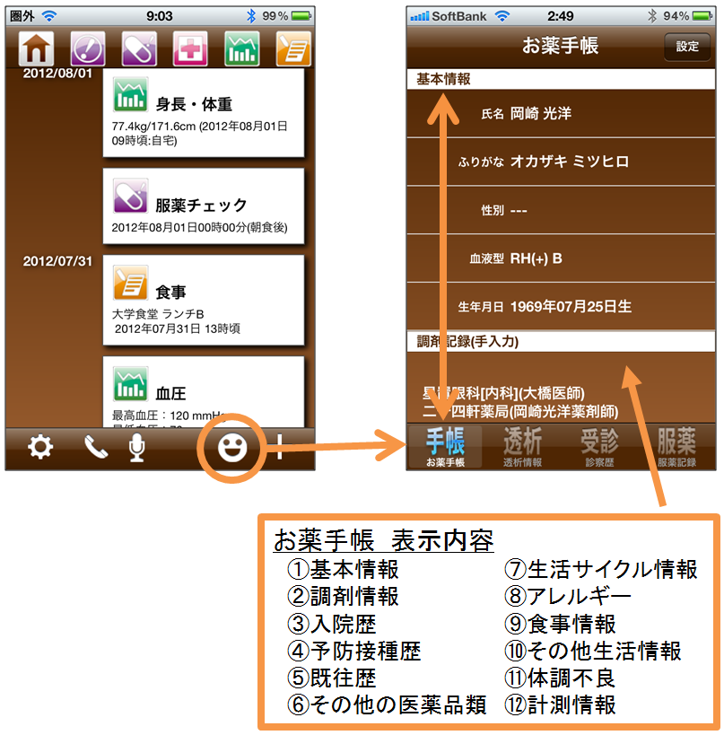 これまでノートで持ち歩いていたお薬手帳をイメージして、医師や薬剤師に現在の自分の状態を確認してもらう為に、お薬手帳表示(一覧表示画面)を用意しました。
