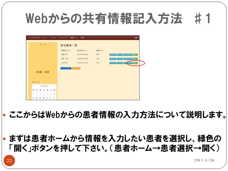 情報を入力したい患者氏名の欄の緑色ボタン【開く】(赤丸部分)を押すと患者レポートが時系列で表示されている「ポータル」というページに移動します