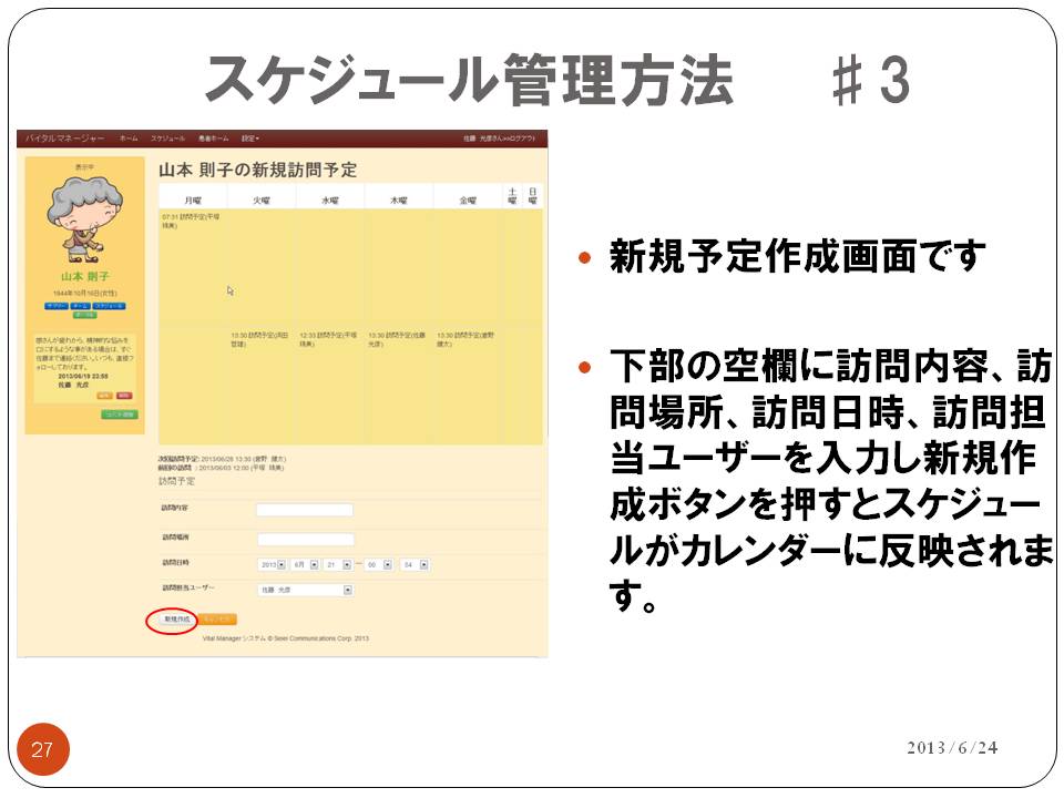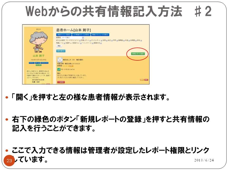 【開く】クリック後の画面です。患者ごとのページになっています。訪問後の患者情報の入力を行いたい際は画面赤丸の【新規レポート登録】ボタンを押してください。