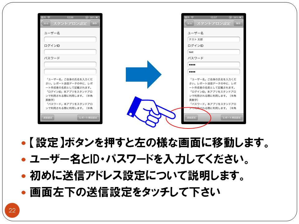 そのほかに、記録を行ったレポートを送信するアドレスや緊急時の連絡先、入力を行うレポート項目などを細かく設定することができます。