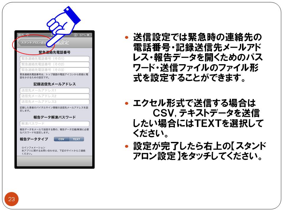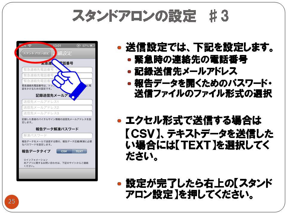 エクセル形式のデータがほしい場合は【CSV】を、テキストデータがほしい場合には【TEXT】を選択してください。すべての入力が完了したら画面左上の【スタンドアロン設定】を押し、初めの設定ページに戻ってください。