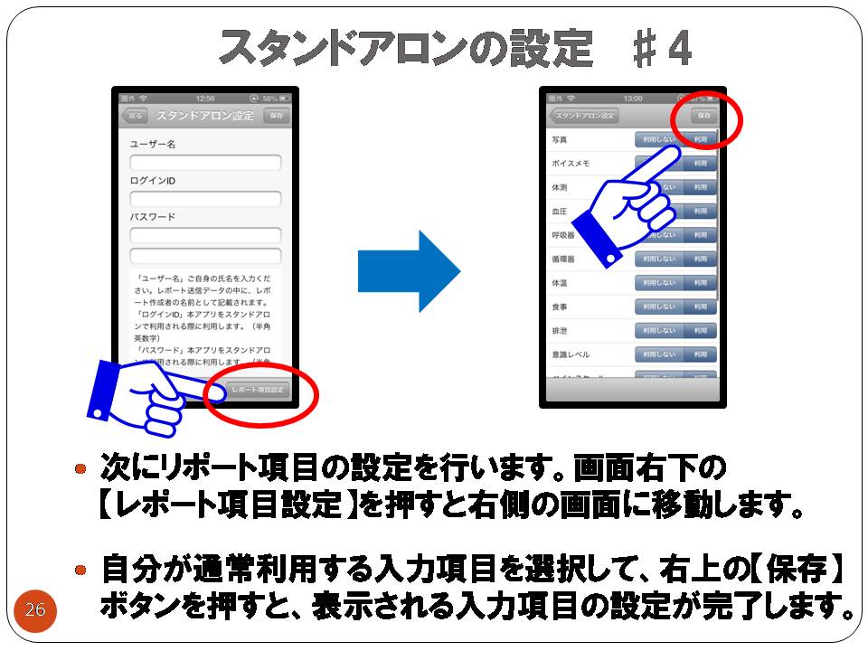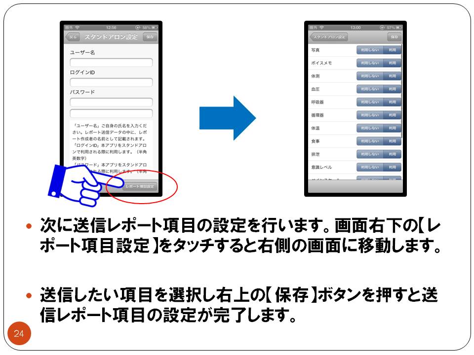 スタンドアロン設定のページに戻ったら、画面右下の【レポート項目設定】ボタンを押してください。右側の画面に移動します。ラジオボタンを押すことで入力を行う項目を設定することができます。送信を行いたい項目にチェックをつけたら画面右上の保存ボタンを押し、設項目設定を終了します。