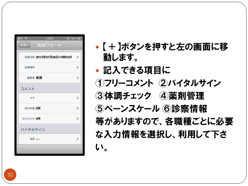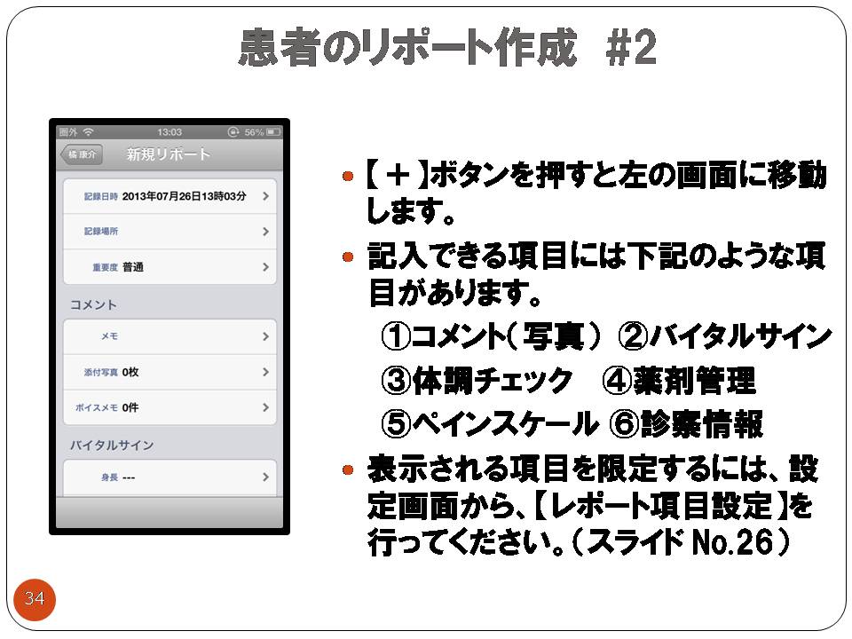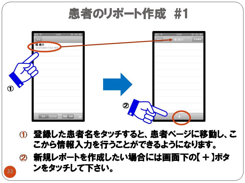 登録した患者の名前をタッチすると画面右の患者ページに移動します。新規レポートを作成したい場合には画面下の【+】ボタンを押してください。