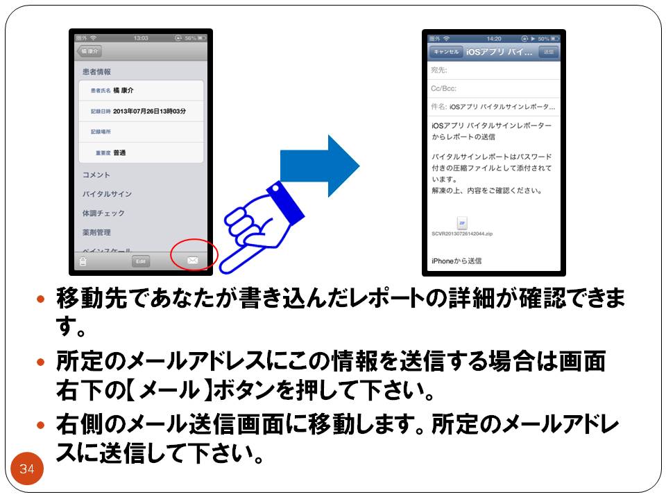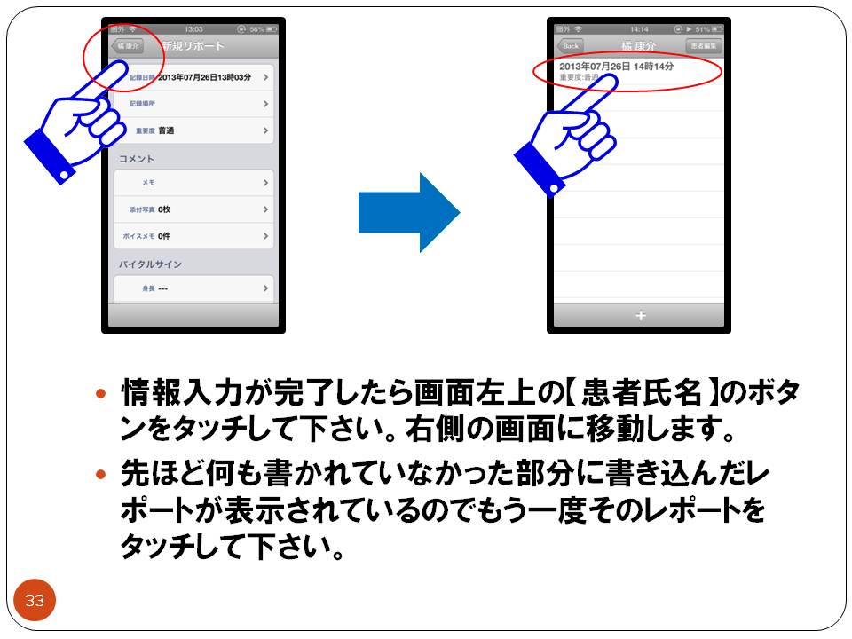 情報入力が完了したら画面左上の【患者氏名】が書かれているボタンを押すと右の画面に移動します。入力が行われた日付のレポートが表示されているので送信を行いたいレポートをもう一度選択します。