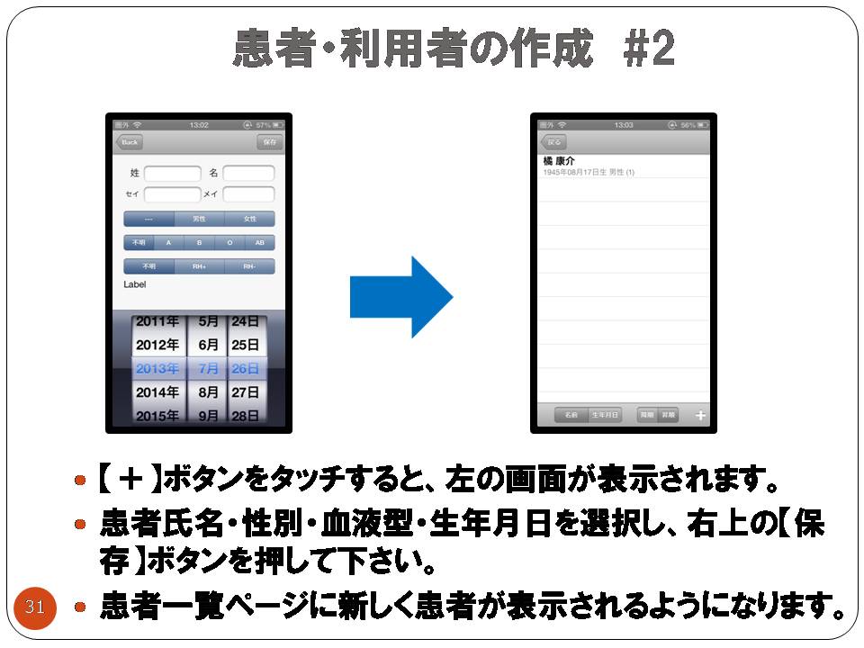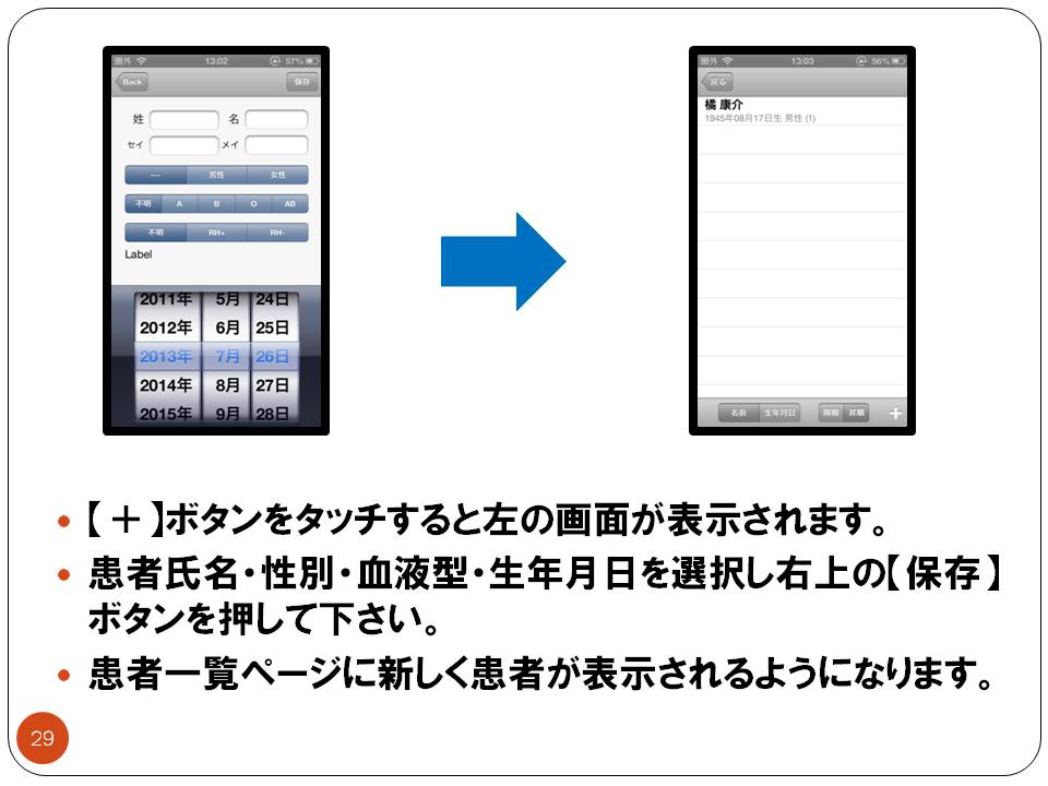 【+】ボタンをタッチすると左の画面が表示されます。患者情報入力画面では患者氏名・性別・血液型・生年月日を入力することができます。