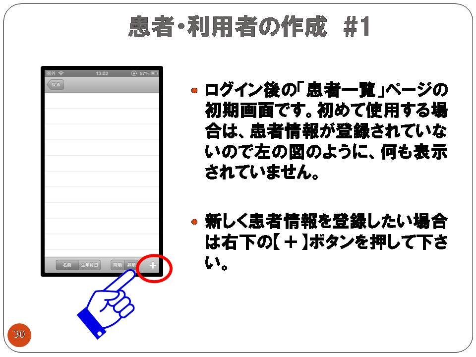 はじめて使用する場合には患者情報が登録されておらず、何も表示されていませんので、ます患者登録を行います。